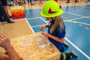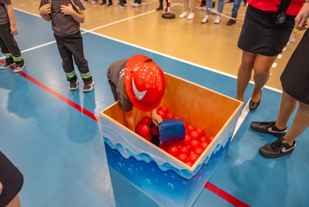 Symulacja gaszenia pożaru: na torze są dwie skrzynki — „zbiornik” z 150 piłeczkami i „płonący budynek”. Zawodnicy napełniają wiadro piłeczkami i przekazują je kolejno aż do drugiej skrzynki; celem jest przelanie wszystkich piłeczek. Wysypanie ostatniej piłeczki do skrzynki nr 2 kończy konkurencję.