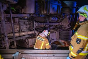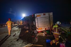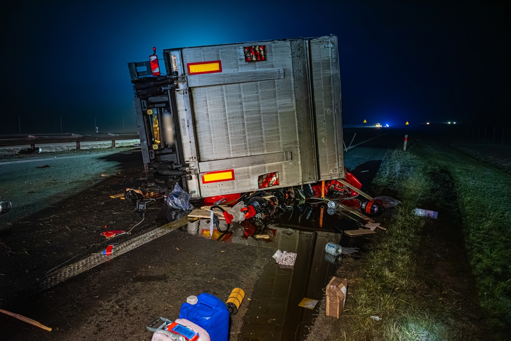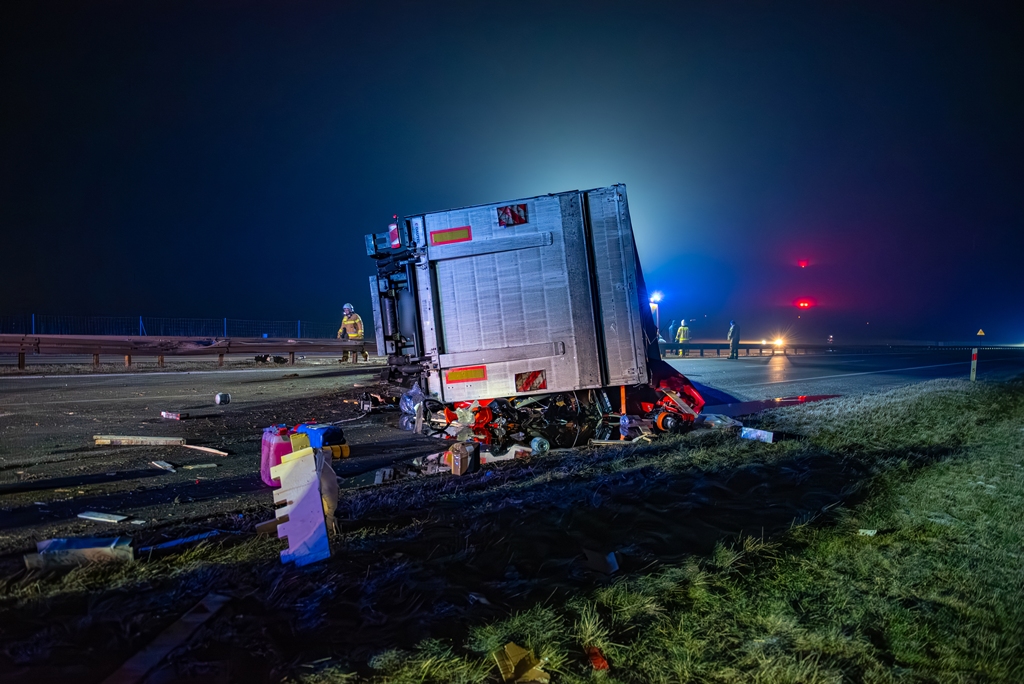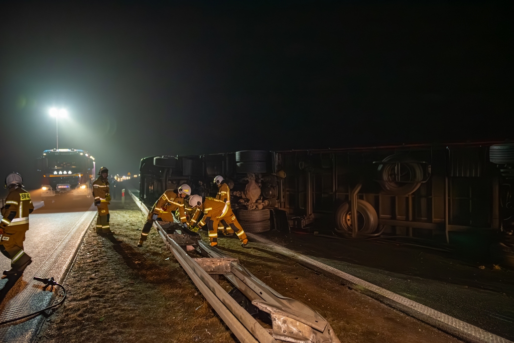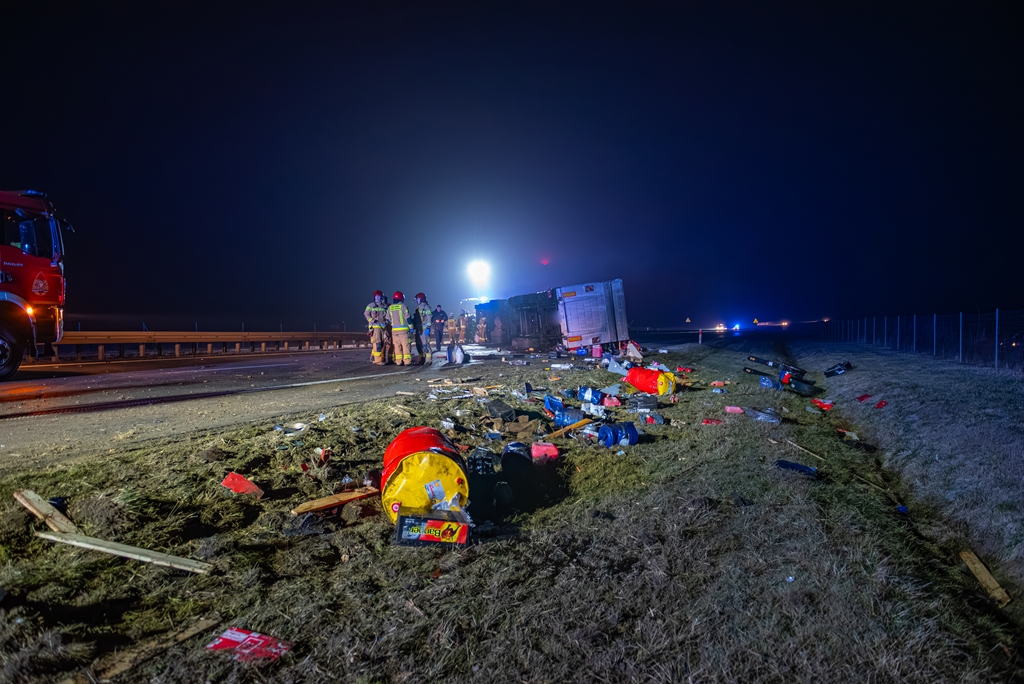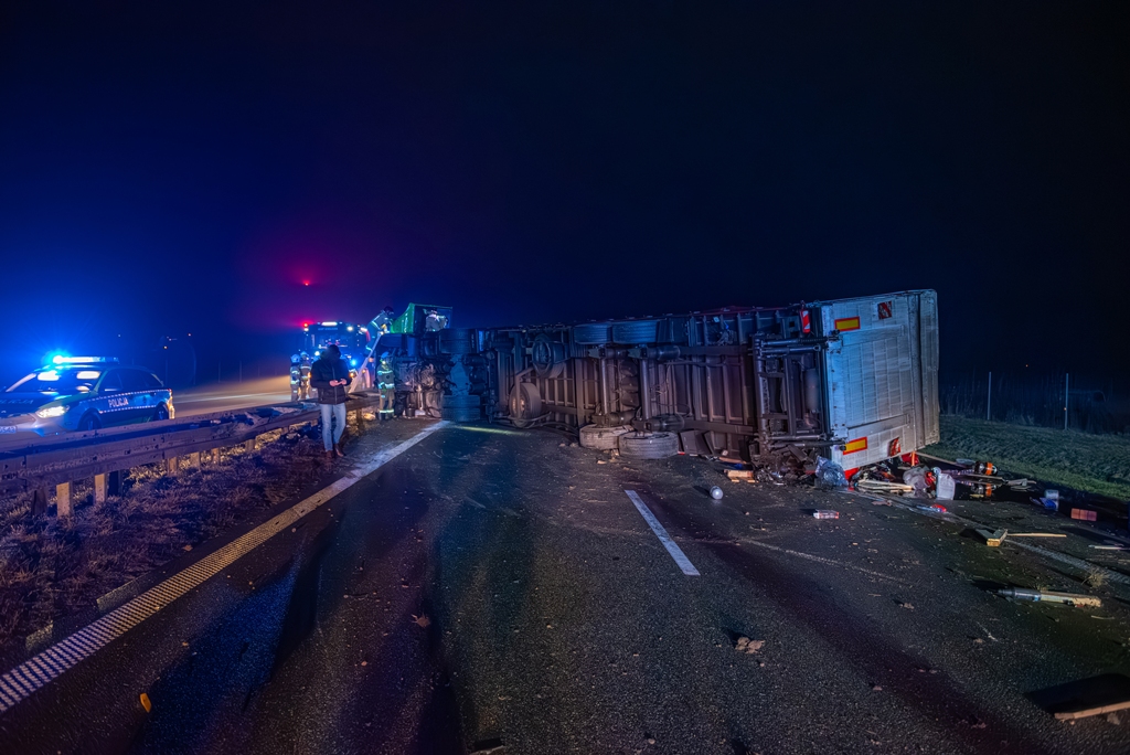 Do drugiego, znacznie poważniejszego zdarzenia doszło około godziny 22:40 na pasie od Jarocina w kierunku Poznania. Samochód ciężarowy z naczepą przewrócił się, całkowicie blokując obwodnicę Jarocina w kierunku Poznania. W wyniku tego zdarzenia ruch na tej nitce drogi został wstrzymany na kilka godzin.