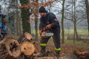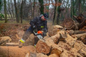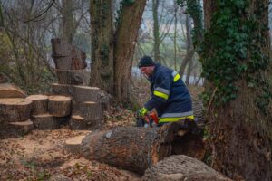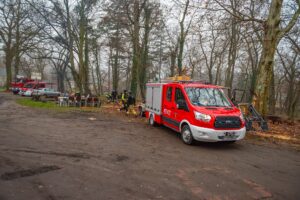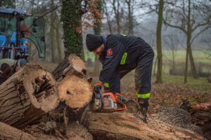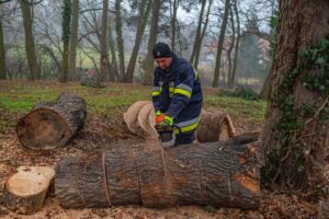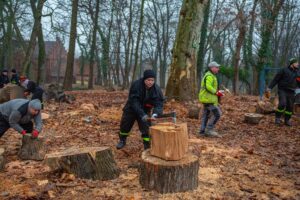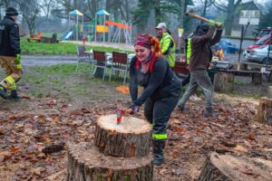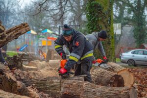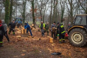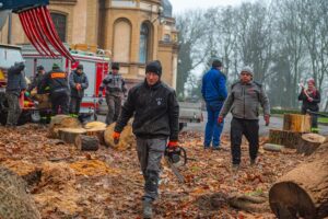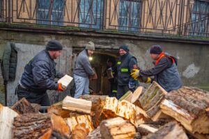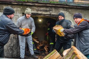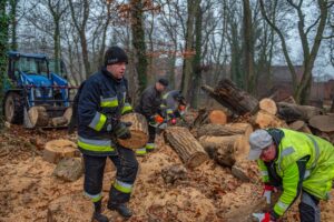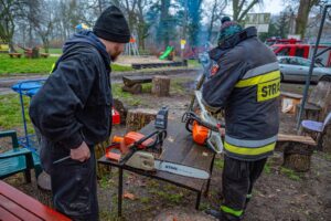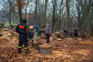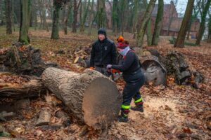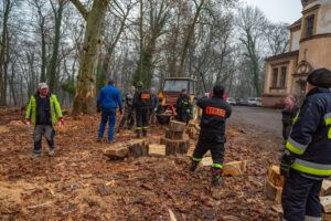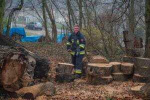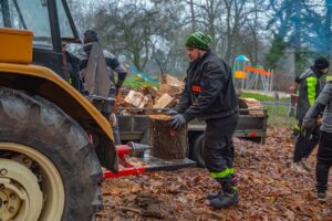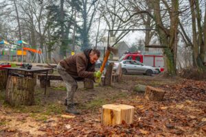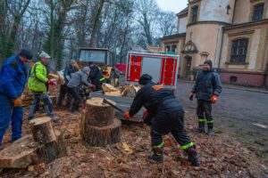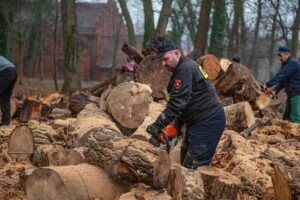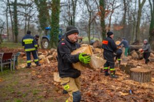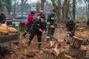 Na terenie parku, na którym znajduje się placówka, strażacy przeprowadzili prace polegające na pocięciu i porąbaniu drzewa. Pozyskany w ten sposób materiał zostanie wykorzystany jako opał, co realnie wesprze funkcjonowanie domu dziecka w okresie zimowym.