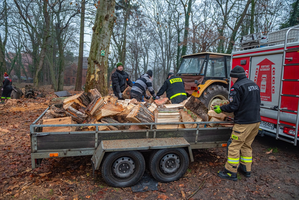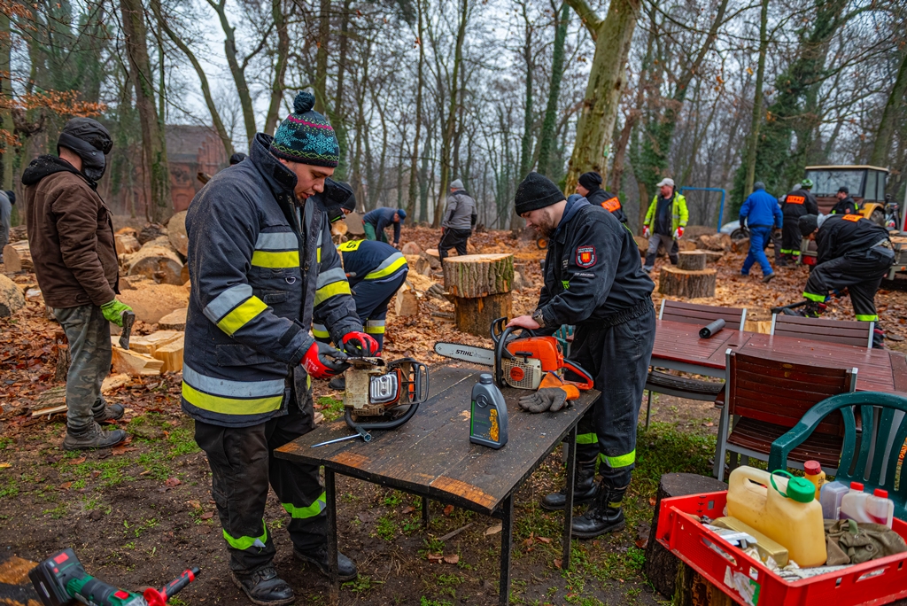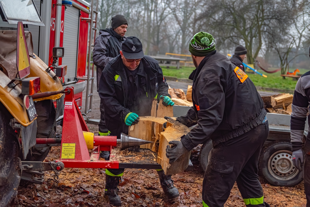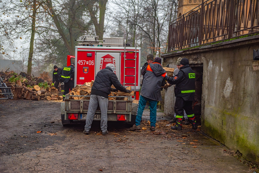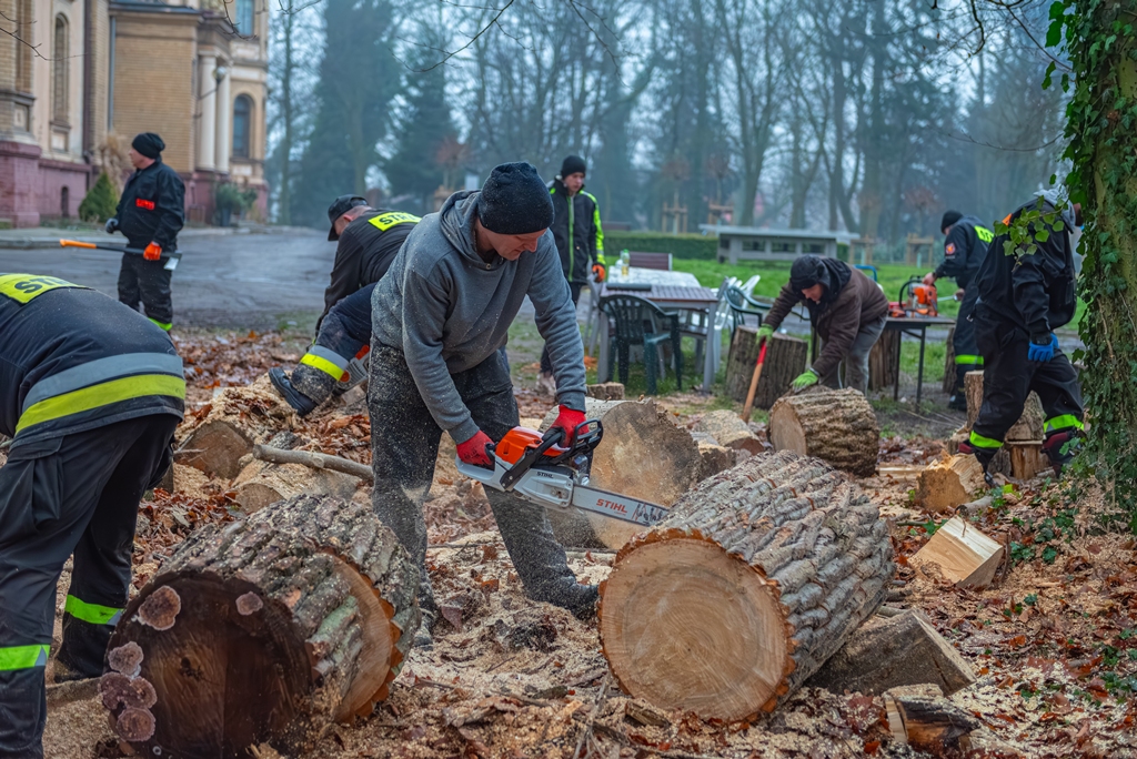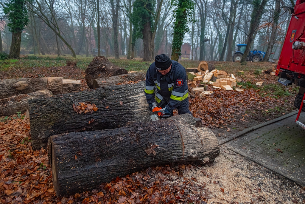 Na terenie parku, na którym znajduje się placówka, strażacy przeprowadzili prace polegające na pocięciu i porąbaniu drzewa. Pozyskany w ten sposób materiał zostanie wykorzystany jako opał, co realnie wesprze funkcjonowanie domu dziecka w okresie zimowym.