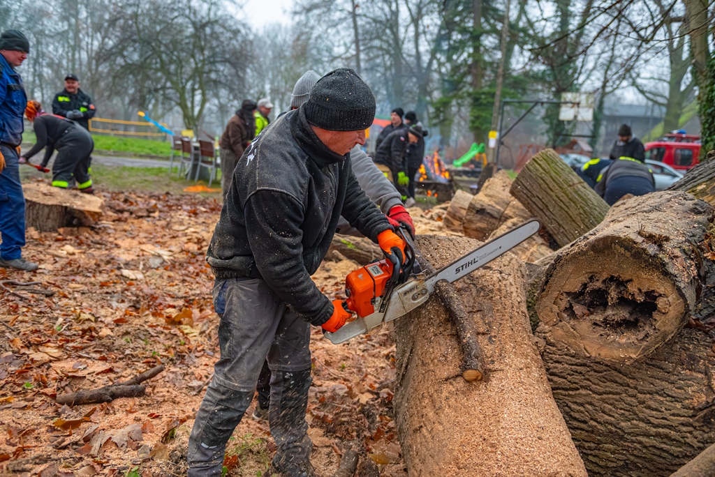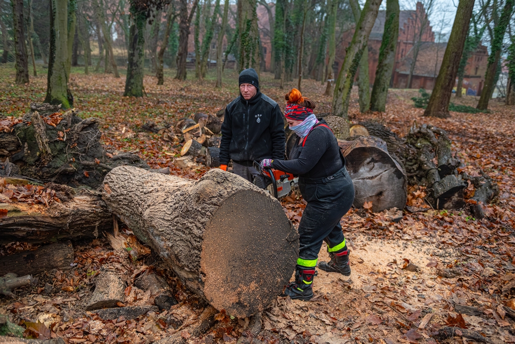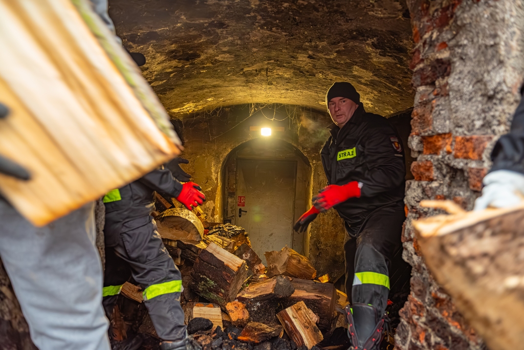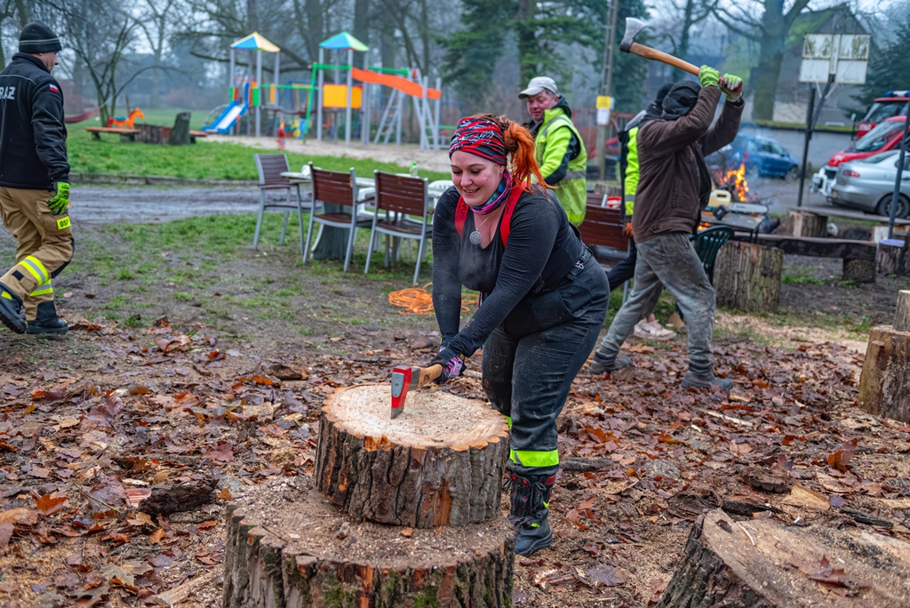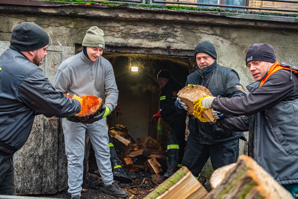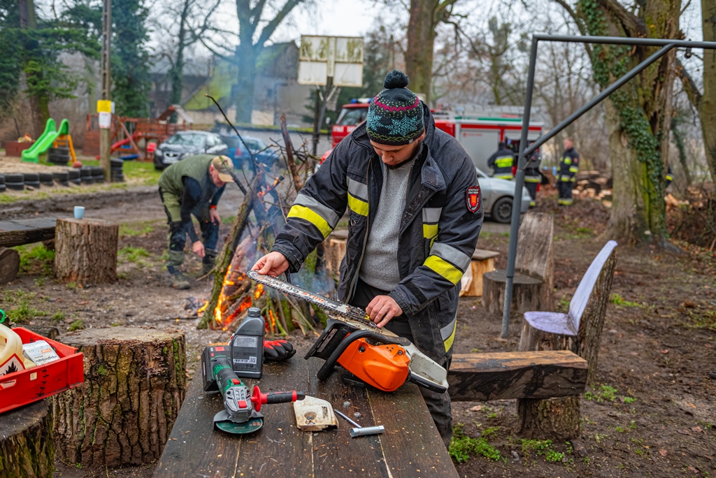 Na terenie parku, na którym znajduje się placówka, strażacy przeprowadzili prace polegające na pocięciu i porąbaniu drzewa. Pozyskany w ten sposób materiał zostanie wykorzystany jako opał, co realnie wesprze funkcjonowanie domu dziecka w okresie zimowym.