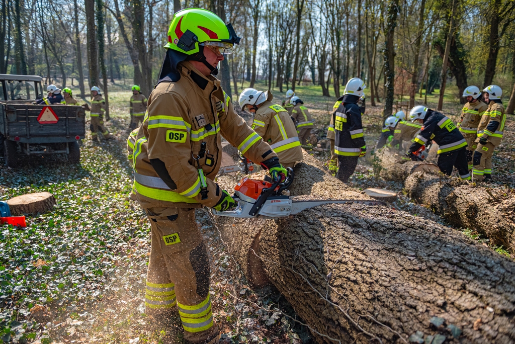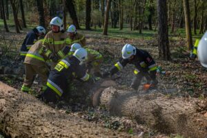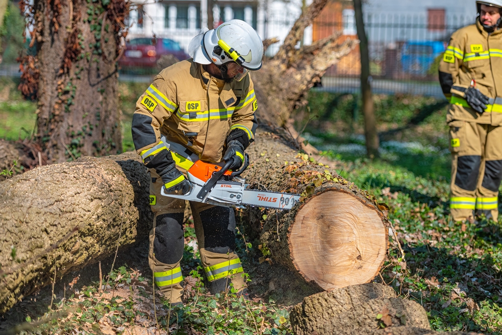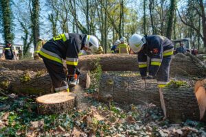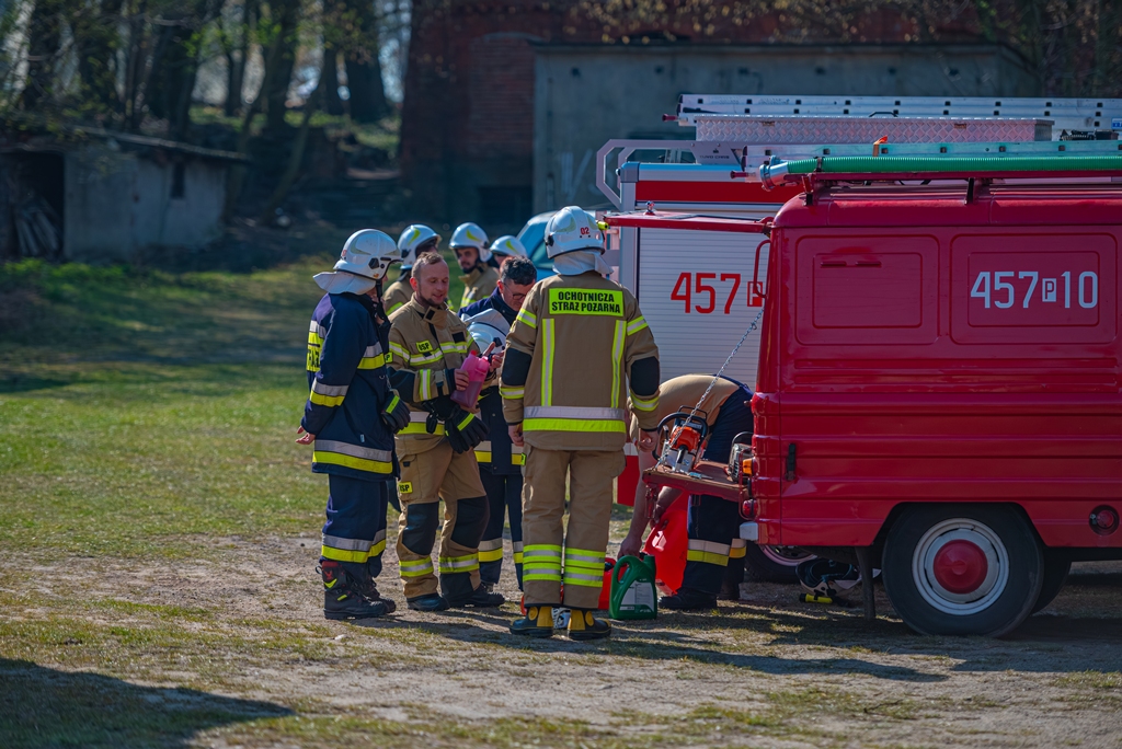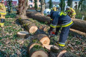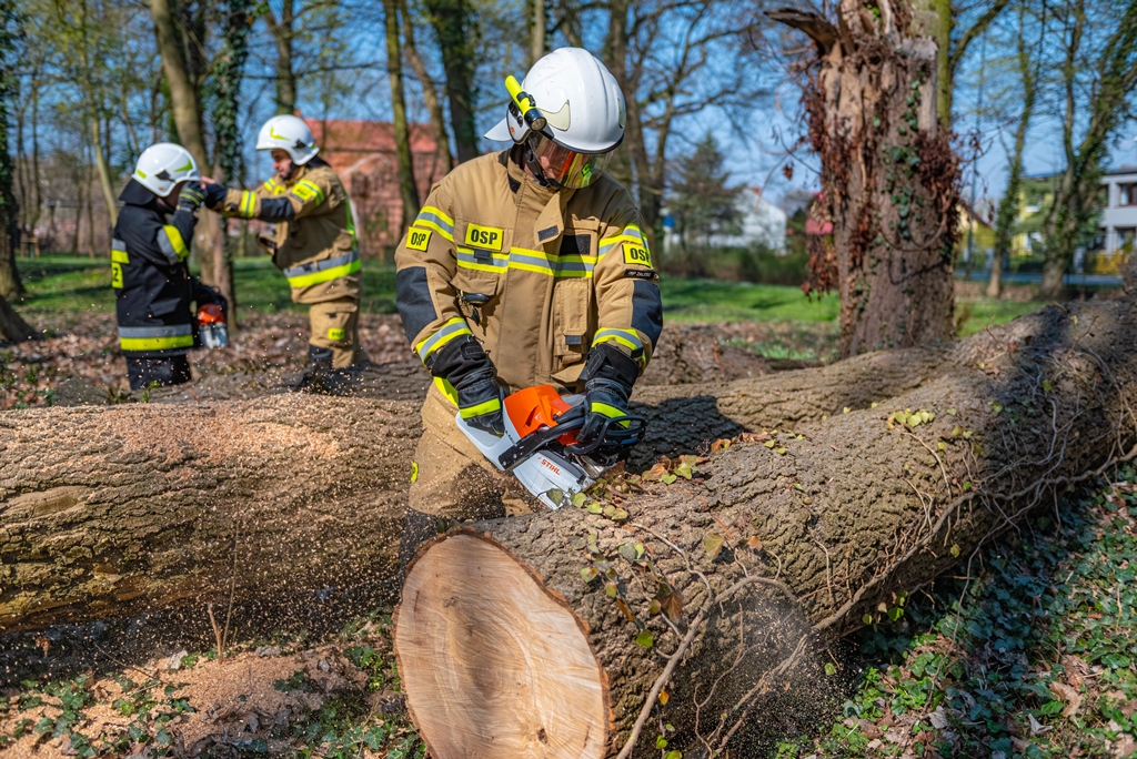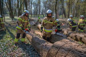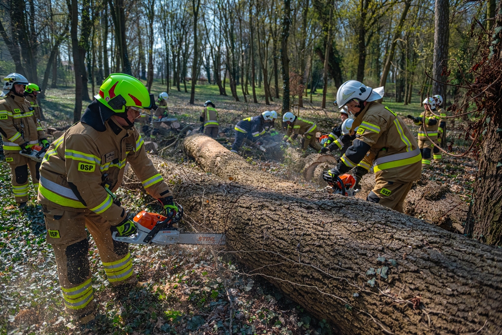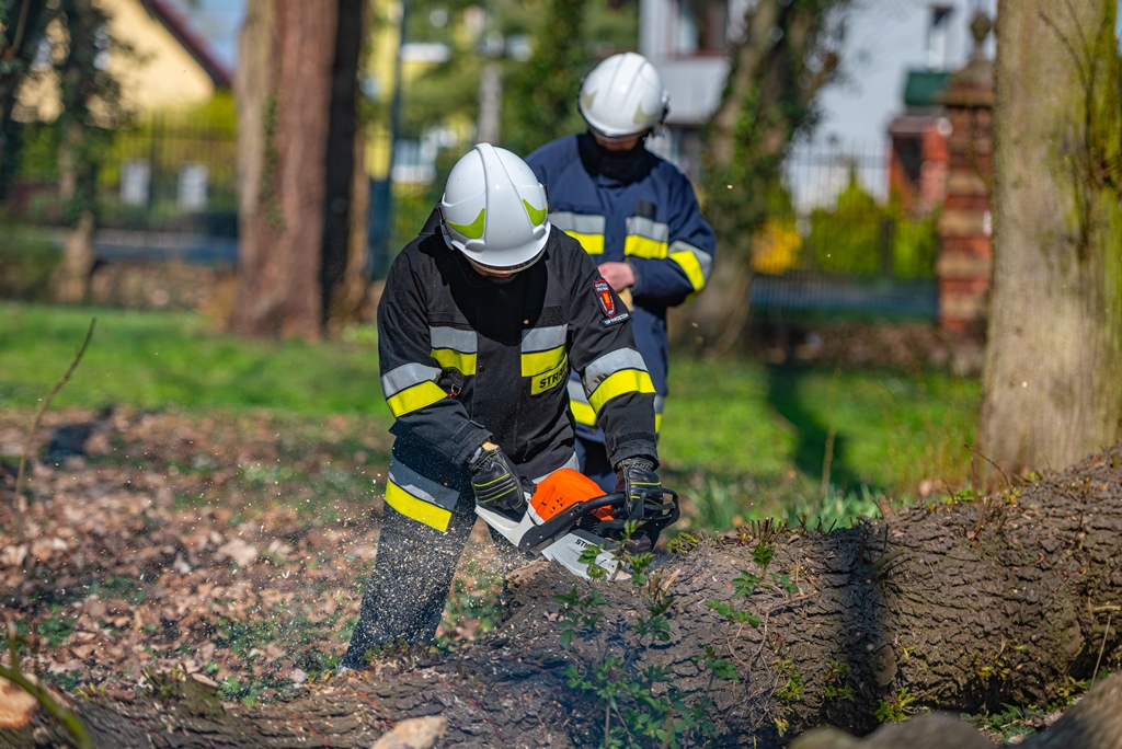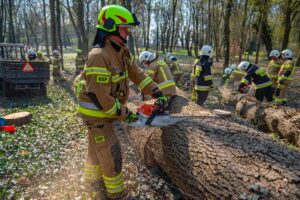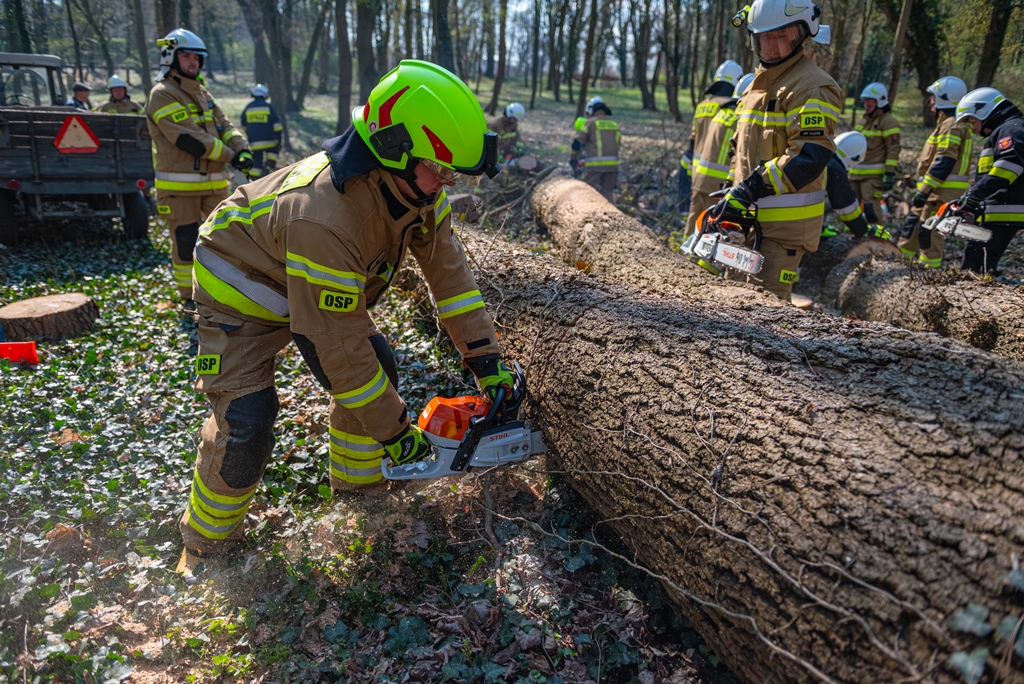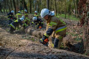 W ramach części praktycznej druhowie przeprowadzili również ćwiczenia z obsługi pilarek spalinowych. W ich trakcie usunięto wiatrołomy znajdujące się w pobliskim parku. Pozyskane drewno zostało przekazane do miejscowego domu dziecka w Górze, gdzie będzie wykorzystane do ogrzewania budynku.
